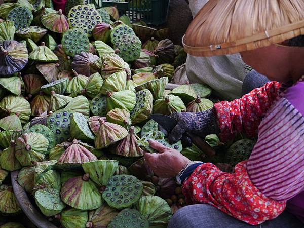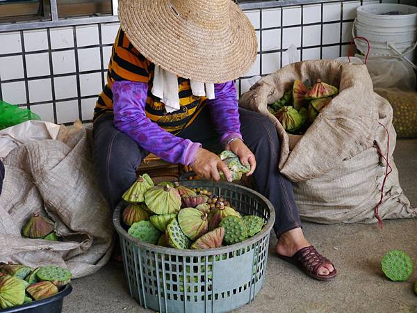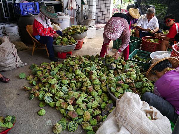 農家正辛勤的忙著挖取蓮子,地上堆置大批蓮蓬。