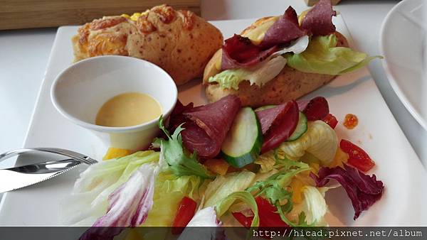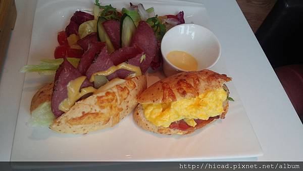 香煎火腿捲蘑菇起士蛋,吃進嘴裡的蛋綿密濃郁充滿起士香味,整個輕食套餐真的很豐富!