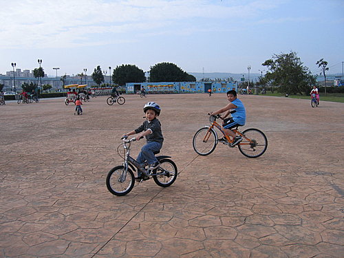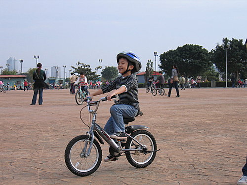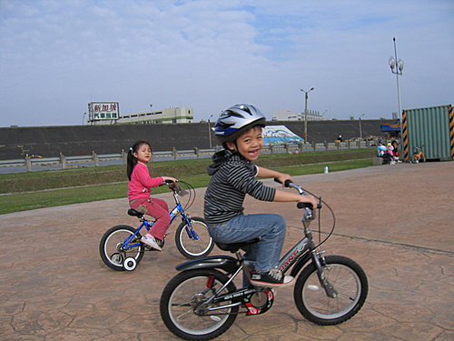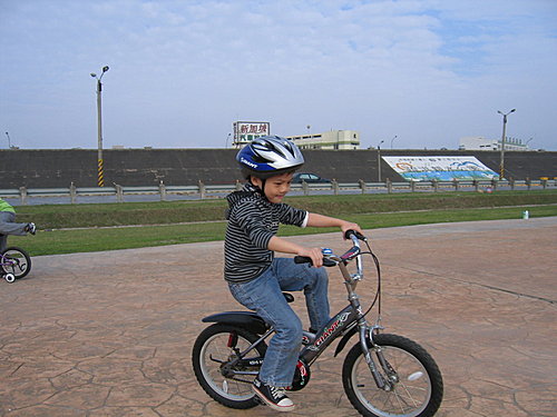 翌日,為了讓他保持手感,下午馬上帶他再去練騎,嗯!VERY GOOD!騎得很好哩!真是有運動細胞!這完全歸功於他不怕摔,每次摔倒,我都不去扶他,他自己拍拍身子就扶起車子再練習!再則是選一輛他腳踮得到地的車子,比較有安全感!